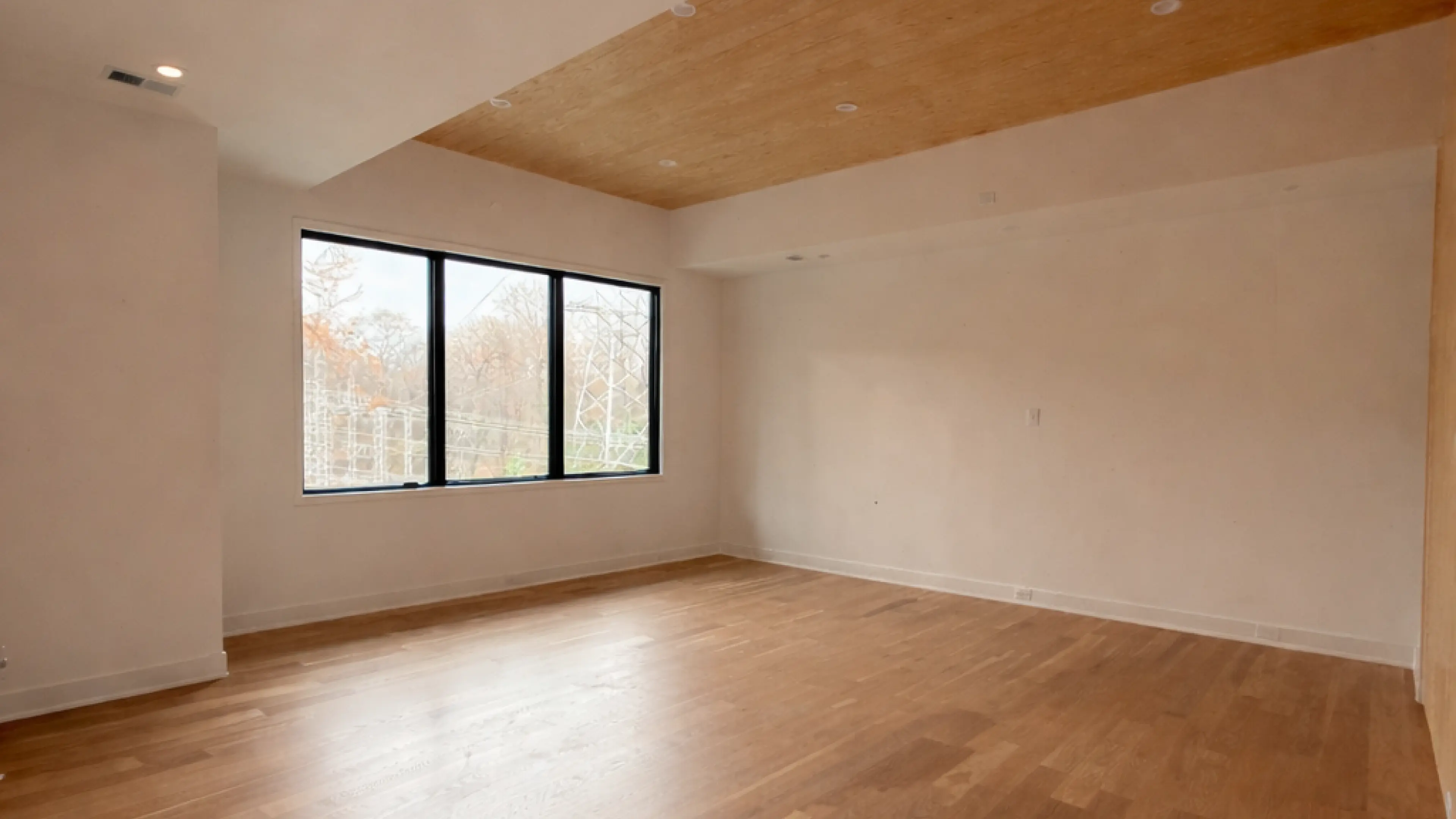 A custom Foxcroft addition designed as a dedicated golf simulator room highlighted by a waterfall wood ceiling and integrated wall feature.